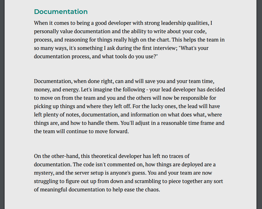 "What does it take to be a good developer? It's a developer that has leadership qualities, someone able to direct a team, ensure focus is aimed in the right direction, needs of the company are being met, and the relationships between the developers and the rest of the team are healthy. Being a developer with leadership qualities doesn't often come easily or naturally. It takes effort and a desire to make a difference in order to find yourself being that person."